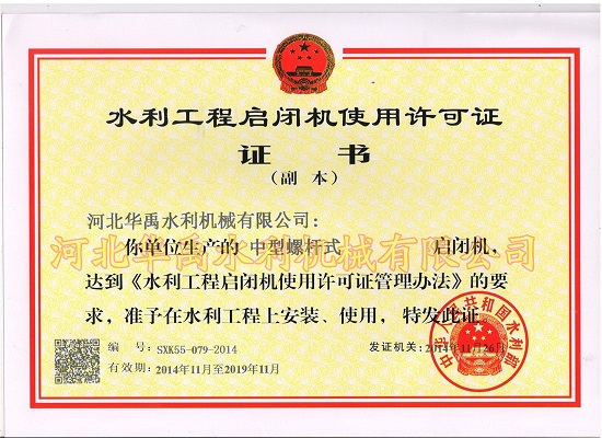 产品名称: 螺杆启闭机使用许可证 |